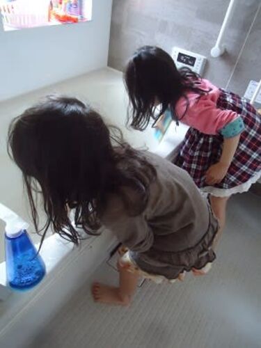 私の嫌いな家事のうち、三本の指に入るのがお風呂掃除 子供たちに「お風呂の掃除をしてみたくない?」って聞いたら「やりたい!」って言うのでお願いしたよ 双子みたいにソックリな子供たちだけど、手前が次女で、奥のスカートが濡れないように胸まであげて…